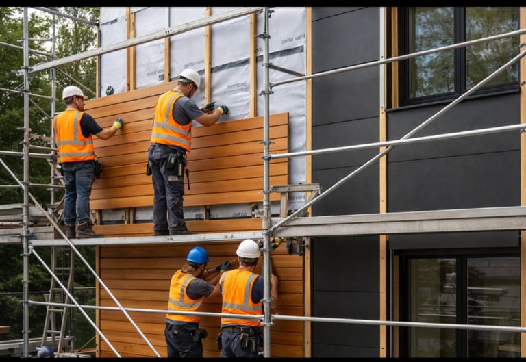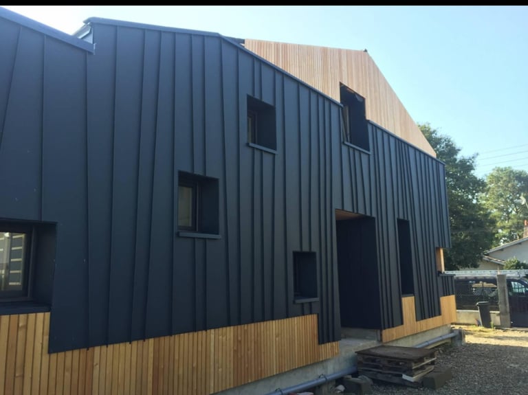 Travaux de bardage en cours, réalisés avec précision et savoir-faire.